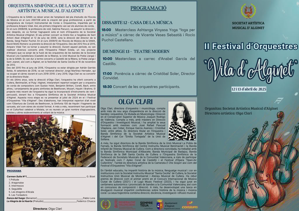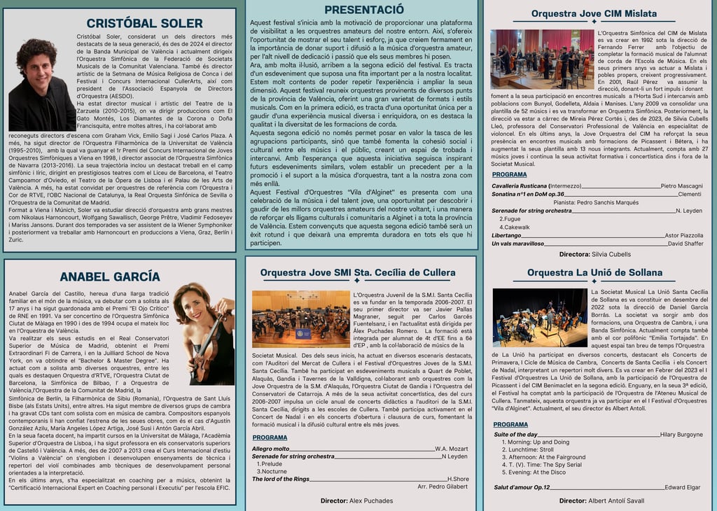Este proyecto, el Festival de Orquestas “Vila d’Alginet”, nació con el profundo deseo de crear un espacio donde la música de orquesta amateur tuviera la visibilidad y el reconocimiento que merece, destacando el talento, la dedicación y la pasión de sus integrantes.