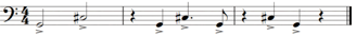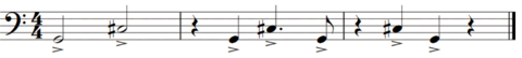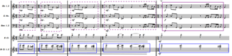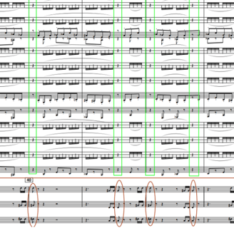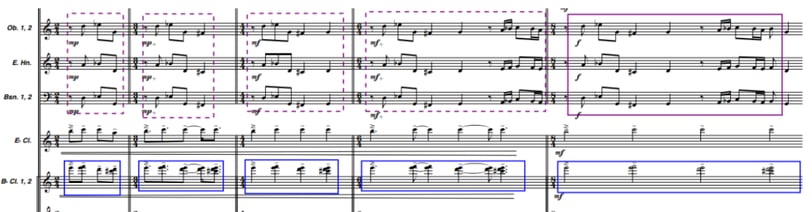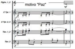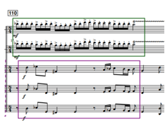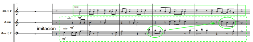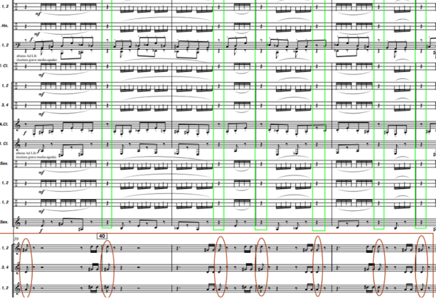 Para representar este concepto, el compositor asigna sonidos indeterminados a la madera que simulan la suciedad sonora sobre la que se “limpia” el grafiti con silencios siguiendo la anatomía rítmica del tema principal. A partir del compás 39, este recurso aparece claramente indicado: trompas y fliscornos ejecutan el tema manteniendo su esquema rítmico, pero con notas no prolongadas y alternando con silencios. En esos silencios, los instrumentos de madera tocan notas aleatorias en registros graves y medios, creando una “suciedad sonora” sobre la que se va trazando el tema. De esta forma, cuando las trompas suenan, las maderas callan, y cuando las trompas guardan silencio, las maderas generan esa atmósfera de suciedad sonora.