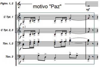 En la tercera sección aparece por primera vez el llamado “Motivo de la Paz”, un breve fragmento melódico basado en la segunda escala octotónica. Se presenta en forma de fanfarria tres veces, como si fuera un recordatorio de que esta sinfonía no es solo un juego de citas, sino también un grito pacifista.