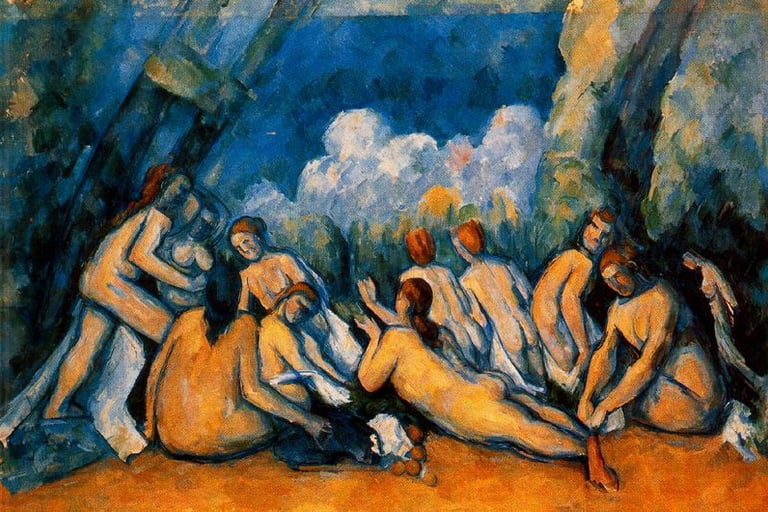 Desde mi experiencia con la música, este planteamiento me recuerda al trabajo con la orquesta. Cada timbre tiene su identidad, pero su efecto cambia según el contexto: un solo de flauta puede sonar etéreo o cortante, según el color armónico que lo rodea. De igual manera, Kandinsky señala que cada forma posee un sonido interno, y que las combinaciones pueden generar armonía... o disonancia. Como en una partitura. Como ejemplo se expone Las Grandes Bañistas de Cézanne, 1906. En este caso, el triángulo no es un elemento de apoyo para la armonización del grupo sino el objetivo artístico. Por esto, las figuras humanas no están proporcionadas y se hacen más ligeras y alargadas atraídas por la figura abstracta triangular.