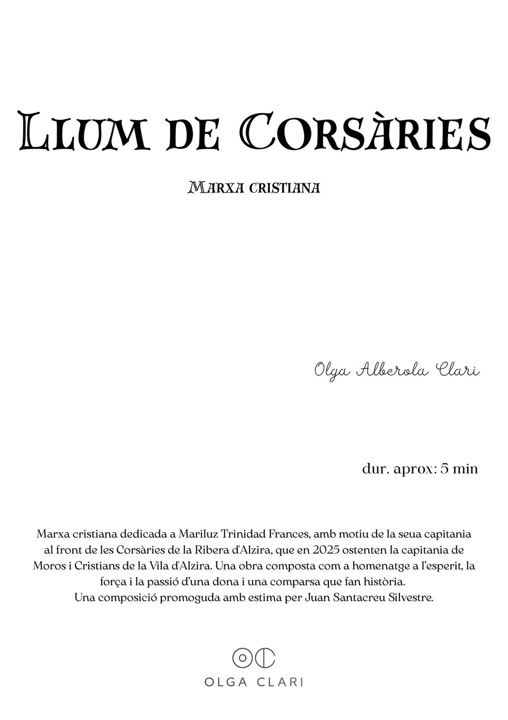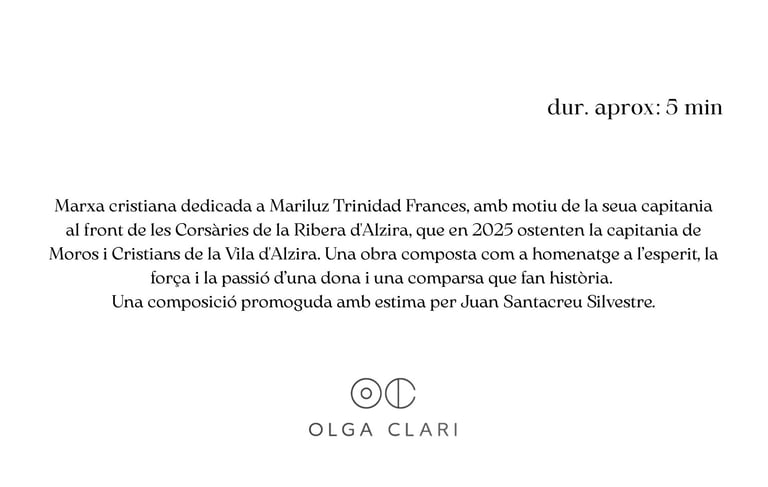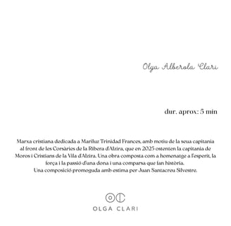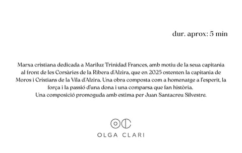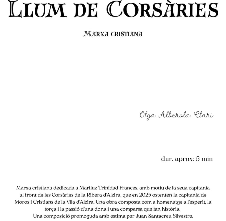 Componer Llum de Corsàries ha sido mucho más que escribir una marcha. Ha sido un viaje personal hacia un terreno poco explorado que es para mí componer, hacia esas entradas de nuestra fiesta en las que aprendí a amar esta música, todo lo que la envuelve y esta manera de vivir la fiesta. Ha sido también un acto de confianza mutua, un regalo que me pidieron con el corazón y que he devuelto intentando plasmar la esencia. Detrás de cada nota está el respeto profundo por esta tradición, la admiración por la fuerza de una comparsa y una mujer como Mariluz y el deseo sincero de emocionar.