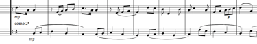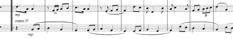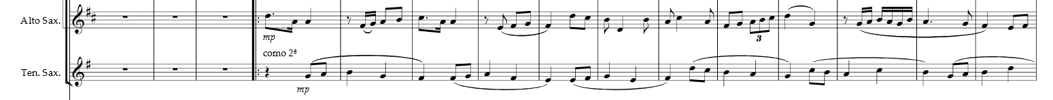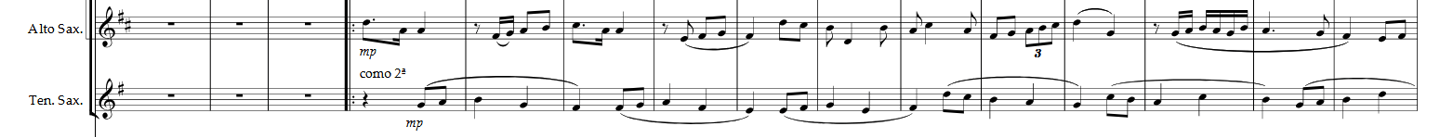 El contrapunto se construye a partir de un fragmento del Canon de Pachelbel, con una variación rítmica por aumentación. En su primera aparición apenas se percibe. Pero en la reexposición… ahí sí se hace notar, con nueva instrumentación y más presencia. A continuación, podemos ver el inicio del tema en saxofones altos y la cita en saxofones tenores: