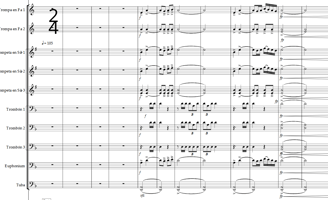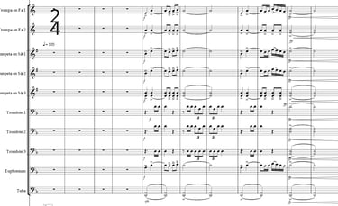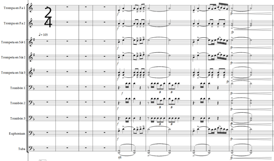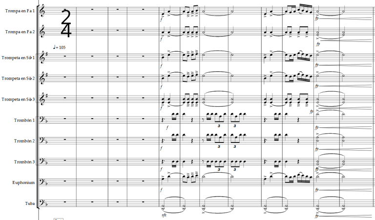 Desde el principio, tuve clara la idea: la introducción debía entrar con fuerza. Sin pedir permiso. Así nació una fanfarria de metales sin tercera, asentada en el pedal de quinta de las maderas. El centro tonal, un Re menor, no se desvela hasta que las maderas entran melódicamente. Del compás 22 al 36 reaparece la quinta insistente en metales, seguida de un giro melódico ascendente de tercera menor en ritmo típico de marcha cristiana en las maderas.